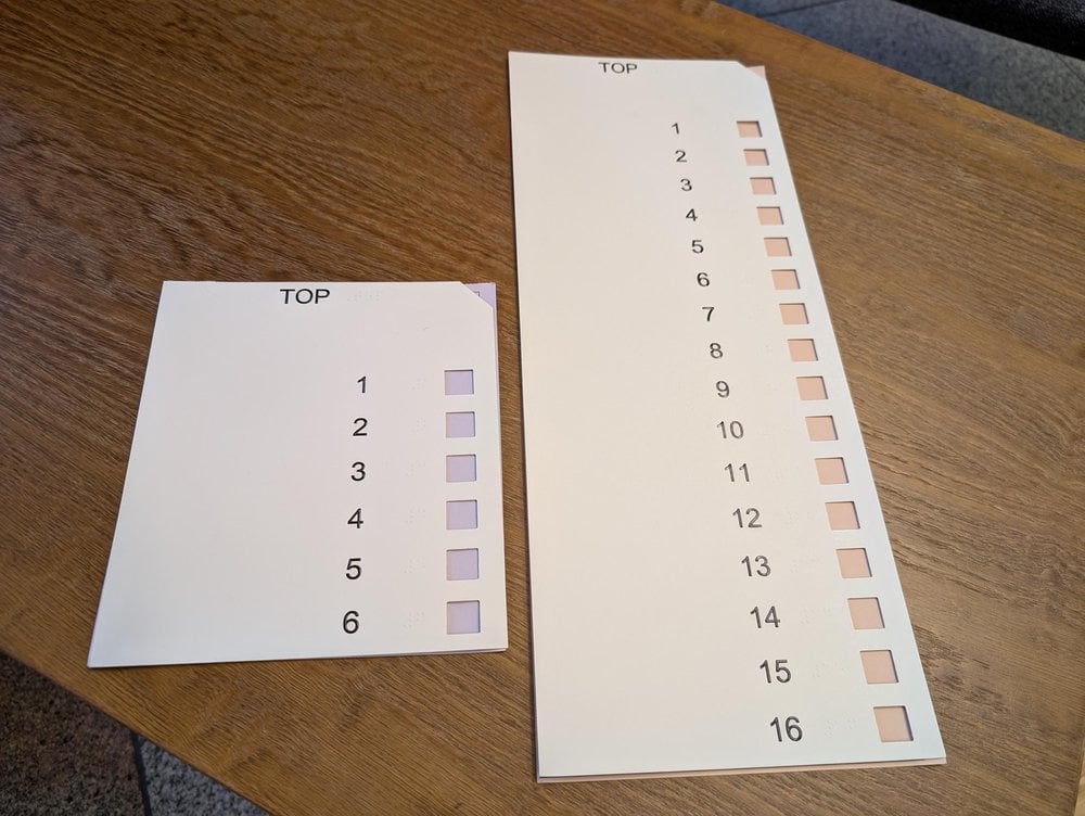 A shorter ballot paper overlay on top of a ballot paper. The white cardboard has cut out boxes, and embossed and braille numbers.